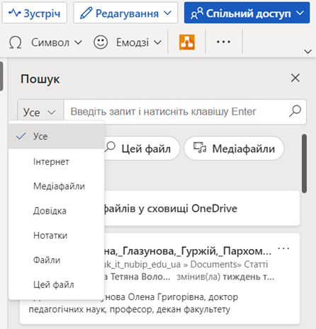 Якщо обрати Цей файл, то є можливість повторно використати об’єкти (ЗображенняПідсвітки) знайдені в даному документі. Також користувач може здійснити пошук необхідних медіафайлів, а також переглядати пропозиції Перегляд файлів у сховищі OneDrive.  Доступна можливість у Word вибрати тип запиту, а саме: УсеІнтернетМедіафайлиДовідкаНотаткиФайлиЦей файл.