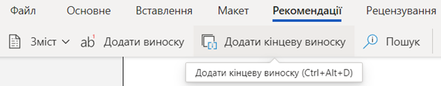 В документі Word користувач може за необхідності додати кінцеву виноску для цього перейти в вкладку Вставлення – Додати кінцеву виноску або використати комбінацію клавіш Ctrl+Alt+D.