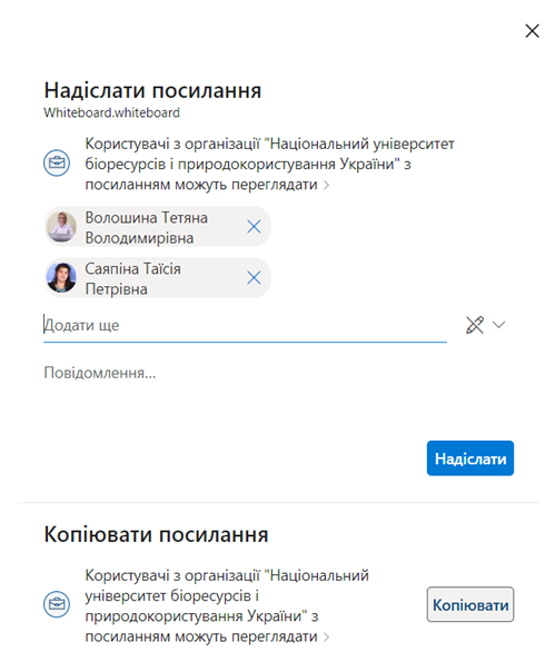 Співпраця команди на одній дошці, вимагає надання до неї доступу іншим учасникам команди. Щоб надати спільний доступ, натисніть Поділитися та у діалоговому вікні налаштуйте параметри спільного доступу: яким користувачам буде доступний перегляд даної дошки за посиланням (усім, в межах організації чи лише обраним), додати користувачів за ім’ям чи е-адресою, а також копіювати посилання для доступу. Після завершення усіх налаштувань, натисніть Надіслати, що дозволить доданим користувачам надіслати посилання для доступу до даної пошти на е-пошту Outlook.