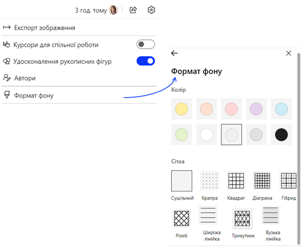 Для зручності співпраці та розміщені на дошці елементів, користувачам доступна можливість налаштування фону кожної дошки. Щоб змінити фон, у Меню параметрів оберіть Формат фону та оберіть бажаний колір чи сітку.