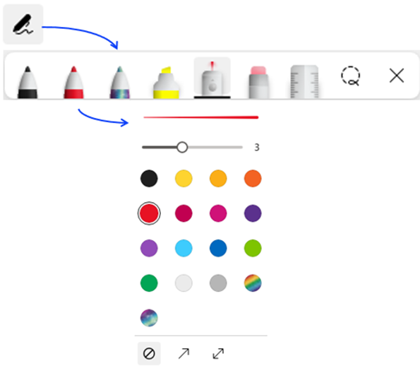 Для додавання графічних елементів на дошку, необхідно обрати інструмент Перо, та тип даного пера (ручка, маркер, лазерний вказівник). Для кожного з елементів доступна можливість зміни кольору, товщини, а також за необхідності додавання наконечників у вигляді стрілки. Для відображення прямих ліній, доступний інструмент Лінійка (ALT+R), або ж необхідно затиснути Shift при побудові лінії. Для видалення елементів з дошки, оберіть інструмент Гумка (Alt+X) та один із її типів: стерти частковий штрих або стерти весь штрих.