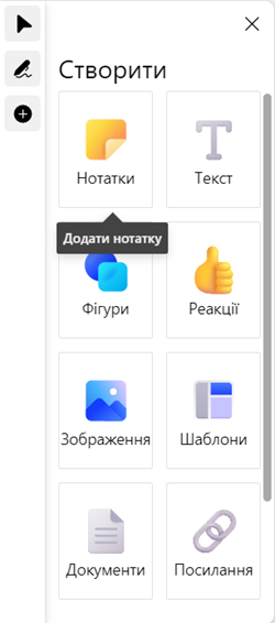 На цифровій дошці доступне розміщення тексту, нотаток, посилань, фігур, відео, зображень, реакцій, документів, посилань, а також використання різноманітних шаблонів. Для створення таких елементів, натисніть Створити та оберіть необхідний елемент.