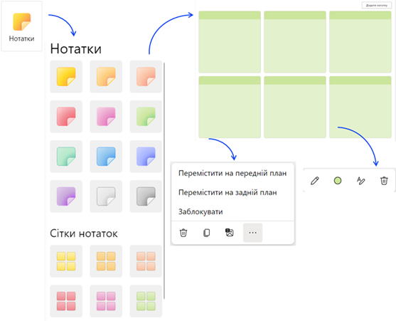Розміщення нотаток на дошці можливе у двох варіантах: розміщення однієї нотатки або сітки нотаток. Для їх використання, натисніть Створити, оберіть Нотатки, тип та колір нотатки та натисніть лівою кнопкою миші на місці дошки, де бажаєте розмістити дану нотатку. У таку нотатку користувачі можуть додавати та форматувати текст, змінювати її колір та розміщення, редагувати текст заміщення, копіювати чи блокувати. При створені сітки нотаток, користувач доступна можливість зміни кількості нотаток у сітці, а також меню управління одразу всіма нотатками у даній сітці.