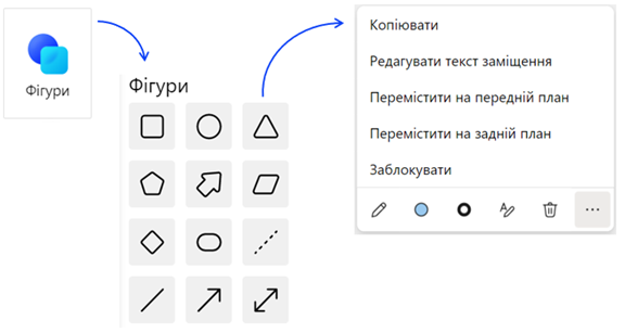 Для використання геометричних фігур при плануванні спільної роботи, натисніть Створити – Додати фігуру або ліні., оберіть одну з доступних фігур та, затиснуши ліву кнопку миші, побудуйте фігуру бажаного розміру у потрібному місці дошки. У такі фігури користувачі мають можливість додавати текст, а також змінювати колір фону чи контору, а також управляти розміщенням даного об’єкту на дошці та відносно інших об’єктів.