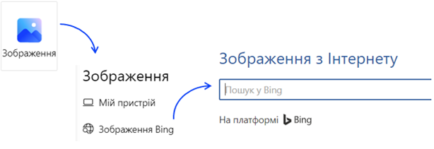 При необхідності використання на дошці зображень, натисніть Створити – Додати зображення та оберіть звідки необхідно додати зображення: з власного пристрою чи знайти у пошуковій системі Bing. Якщо зображення додається із власного пристрою, оберіть Мій пристрій, в діалоговому вікні оберіть місце розташування файлу на пристрої, зображення для розміщення та натисніть Відкрити. При пошуку зображення, оберіть Зображення Bing, введіть пошуковий запит або ж оберіть одну з пропонованих категорій пошуку, оберіть необхідне зображення та натисніть Вставити.