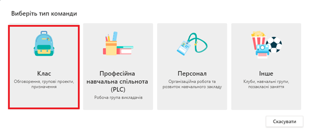 - на наступному кроці обрати тип команди Клас