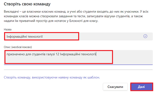 -   додати назву команди, за необхідності опис команди та натиснути кнопку Далі: