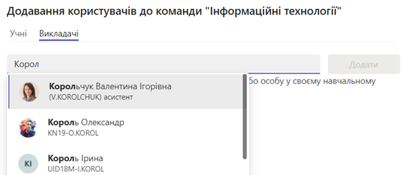 -  та долучити студентів до команди. За необхідності до команди аналогічним чином можна додати інших викладачів.