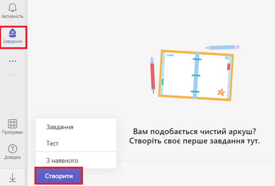 Для створення завдань необхідно перейти у розділ Завдання та натиснути кнопку Створити (Create) та обрати тип завдання (Завдання, Тест, З наявного).