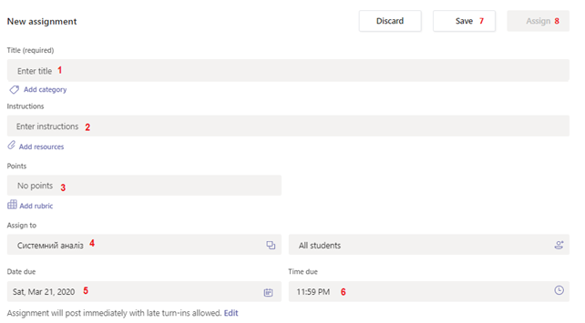 Створюючи Завдання необхідно вказати Назву завдання (1), інструкції з виконання (2), кількість балів (3), для яких команд розмістити дане завдання (4), термін початку (5) та закінчення даного завдання (6). Створене завдання можна попередньо зберегти (7) або розмістити для виконання (8).