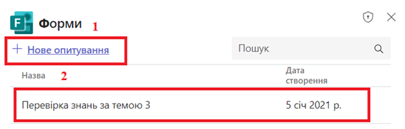 При створенні тесту, можна створити новий тест (1) або розмістити вже наявне опитування створене у сервісі Форми (2).