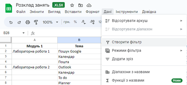 Для того, щоб відфільтрувати дані, необхідно виділити діапазон клітинок. Вибрати вкладку Дані, потім Створити фільтр. Щоб переглянути доступні фільтри, необхідно натиснути значок фільтра у першому рядку діапазону.