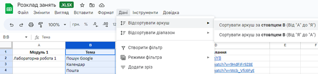 Також можна відсортувати діапазон, для цього необхідно відкрити вкладку Дані > Відсортувати діапазон