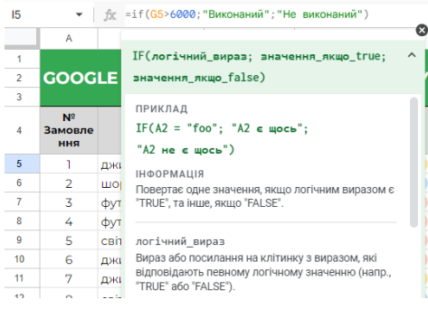 Повертає одне значення, якщо логічним виразом є "TRUE", та інше, якщо "FALSE"=if(G5>6000;"Виконаний"; "Не виконаний")