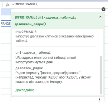 Синтаксис функції IMPORTRANGE виглядає так: