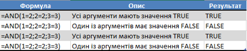 Функція AND застосовується для перевірити істинність всіх умов, які необхідно перевірити та повертає значення TRUE, у випадку, якщо всі логічні умови виконуються.