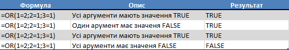 Функція OR застосовується для перевірити істинність хоча б однієї з всіх умов, які необхідно перевірити та повертає значення TRUE, у випадку, якщо хоча б одна з логічних умови виконуються.