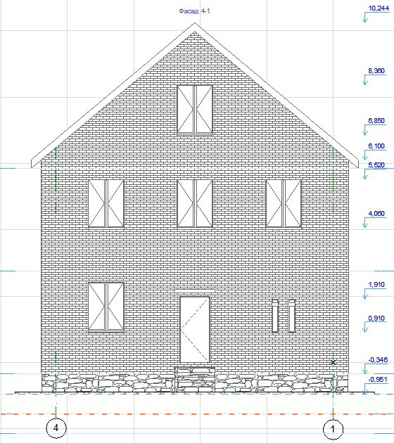 Для виконання креслеників фасадів застосовується інструменти Section Tool або Elevation Tool. Для цього потрібно вказати лінію, паралельну фасаду, напрям зору, а також позначити зображення. Фасад будується автоматично, а його позначення з’являється у панелі навігатора, а також пункті головного меню View (Navigate – Section або Elevation).