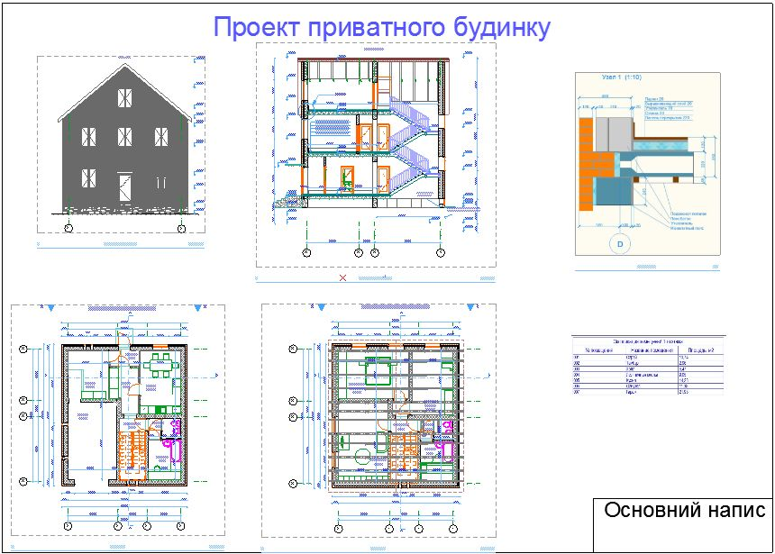 Припустимо, у межах одного аркушу формату А1 слід розмістити креслення фасаду, планів поверхів, один із розрізів, креслення вузла та експлікацію приміщень.