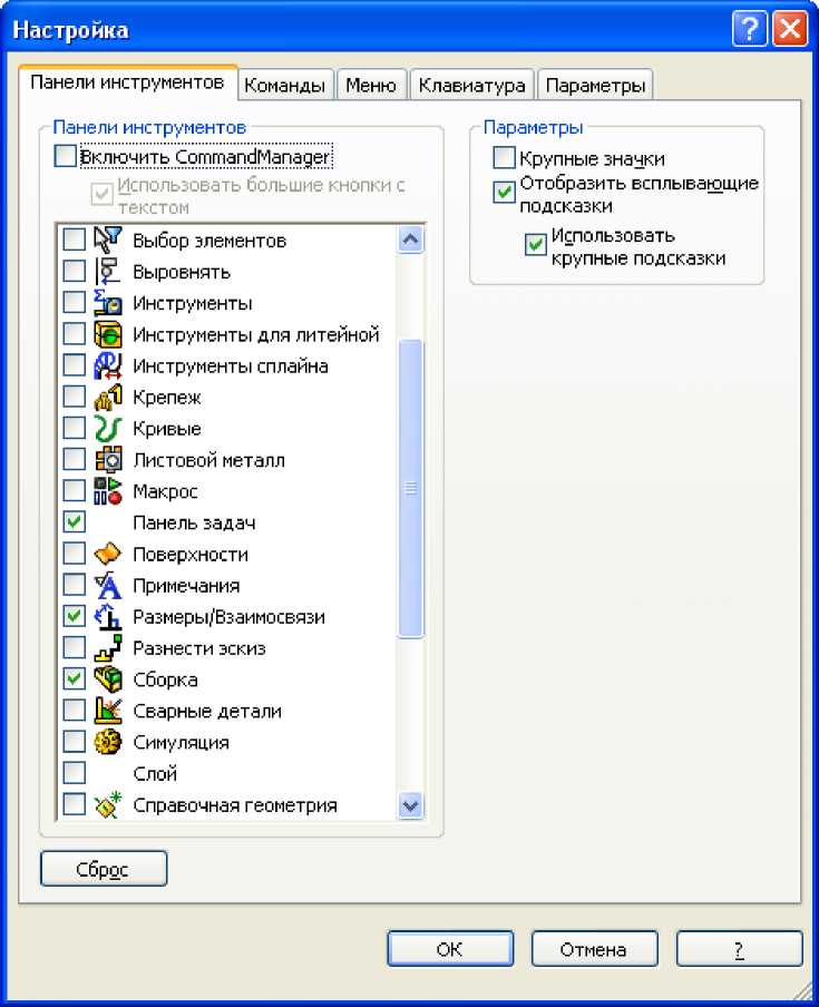Щоб відобразити панель інструментів "Збірка" необхідно ввійти в пункт меню Инструменты, Настройка, вибрати вкладку "Панель инструментов" і поставити галочку напроти слова "Збірка" (рис. 4.1). Панель з'явиться на екрані рис. 4.2.