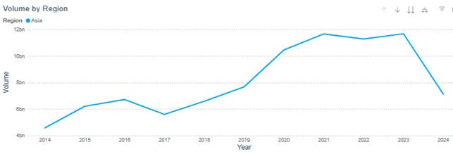 In 2023, the volume of exchange trading on exchange platforms in the Asia-Pacific region reached a record level of 103.4 billion transactions, which is 14.2 times higher than in 2014, when 7.3 billion transactions were recorded.