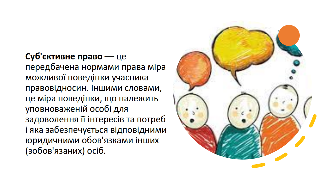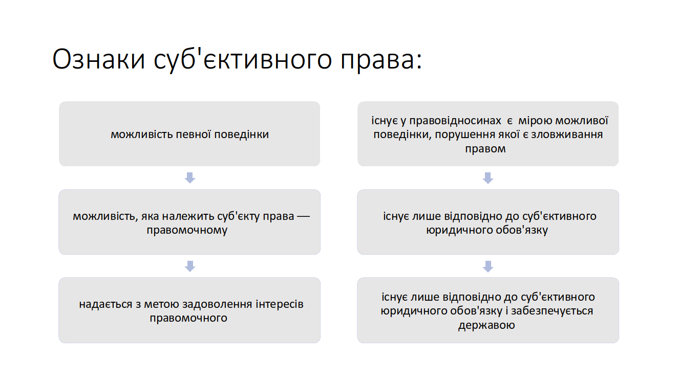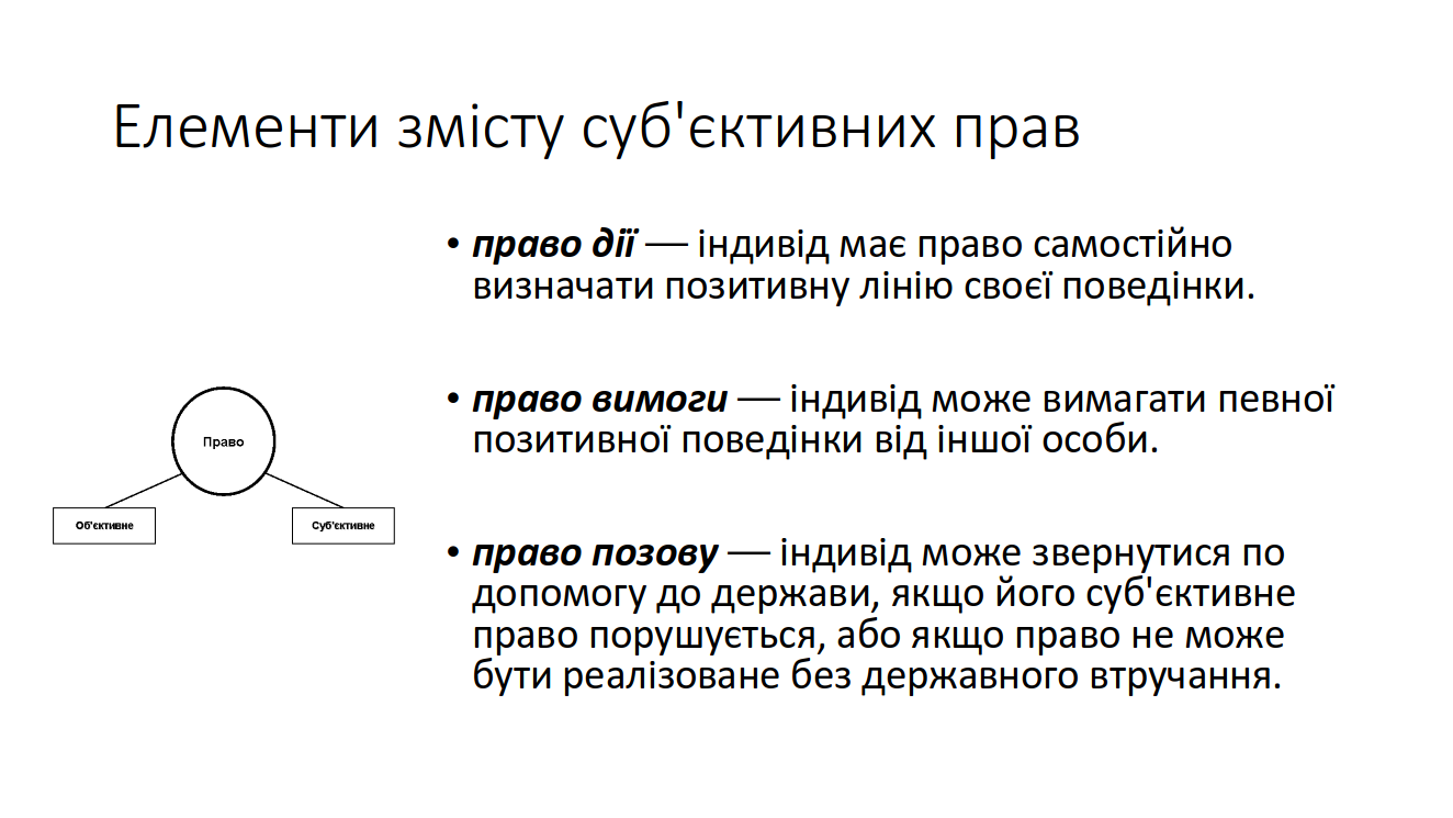 Суб’єктивне право – це закріплені правом певні юридичні можливості особи. Це право на свою юридично можливу поведінку, право на звернення до держави за захистом своїх юридичних можливостей.