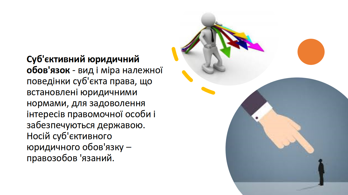 Суб'єктивний юридичний обов'язок - вид і міра належної (або необхідної) поведінки суб'єкта права, що встановлені юридичними нормами для задоволення інтересів правомочної особи і забезпечуються державою Носій суб'єктивного юридичного обов'язку правозобов 'язаний.