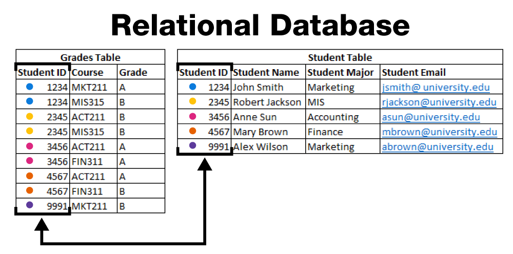 The relational model differs from the above two models in that its main emphasis is not on the control of relationships between levels of the database. It is more a method of linking various types of information into a single database. In a relational database each record of each file has at least one link field which is used to link the data in different files. The student number is a common link field in a University database. On one file a student's name, address, etc. What is will be listed along with the student number. In another file student numbers will appear against course numbers. In another file course number will appear along with details about the course. In yet another file, details of all unpaid library fines will indicate student number versus the amount owed. In the database the numbers will be defined as link fields and database is designed to allow easy access to relevant information in the various files. For example, if you are interested in a list of all students in a course you simply request such a list and the database will get the student numbers from the course list, and then use those numbers to get the student names from another file. These linkages will be transparent to the user who will only see a course list containing student names.