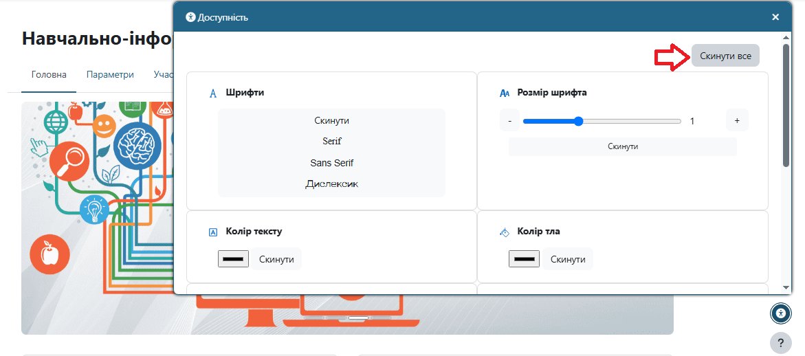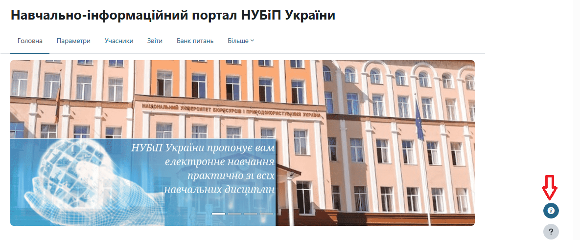 1. В нижній частині екрану з права, приблизно за 3/4 екрану знаходиться сервіс 'Доступність'. Кнопка доступність розташована майже на кожній веб-сторінці навчального порталу.