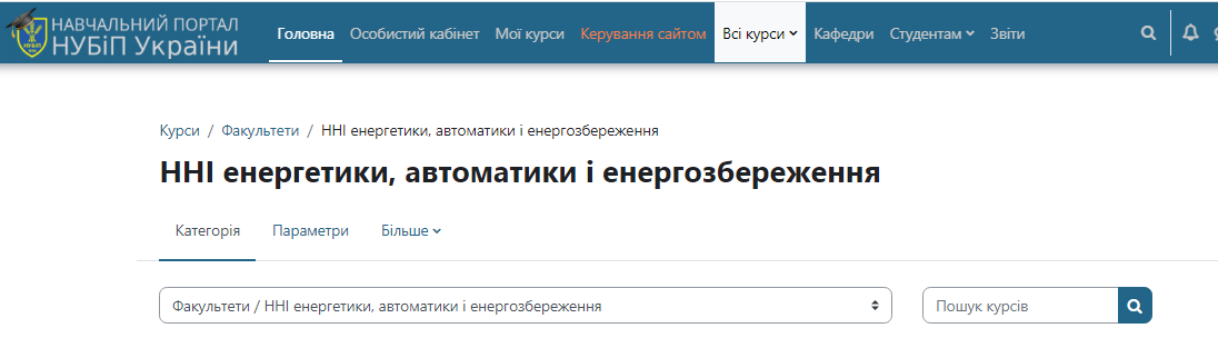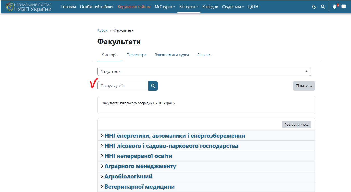 Або: Всі курси (вибрати факультет) - Пошук курсів.
